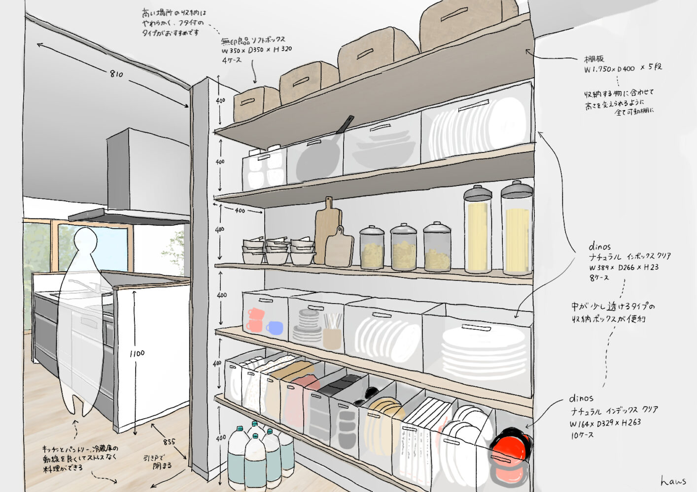この寸法が確保できれば、食品ストック、調味料、保存容器のよく使うモノは収まります。奥行きを600mm以上にすると収納量は増えますが、奥の物が死蔵されやすく、結果として「広いのに使いにくい」パントリーになりがちです。