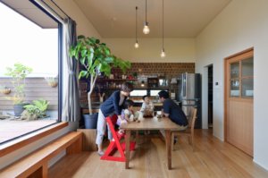 吹き抜けの窓を通して2階の子供室の廊下がリビングとつながっています。